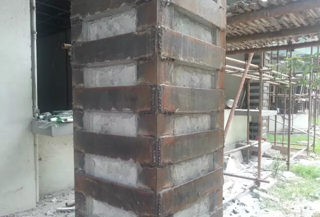 該法是在構(gòu)件外圍包以型鋼的加固方法, 具體可分為濕式外包鋼加固法和干式外包鋼加固法。一般用于混凝土柱、梁、屋架,特別是大型結(jié)構(gòu)和大跨度結(jié)構(gòu)的加固。其中濕法是指型鋼與構(gòu)件通過乳膠水泥、環(huán)氧樹脂等粘結(jié)劑與原構(gòu)件粘結(jié), 新加型鋼與原構(gòu)件形成整體共同工作; 干法指新加型鋼與原構(gòu)件之間不采用粘結(jié)劑粘結(jié), 不能保證結(jié)合面剪力的有效傳遞。在抗震加固中一般采用濕式外包鋼加固法。適用于加固鋼筋混凝土梁、柱及磚柱、磚煙囪等,但對于圓形和曲面構(gòu)件加固工藝則相對復(fù)雜。它具有施工方便,現(xiàn)場工作量少,能有效提高構(gòu)件抗震性能的優(yōu)點, 其優(yōu)點是施工方便,現(xiàn)場工作量少,受力可靠。缺點是用鋼量較大,加固維修費用較高。當采用化學灌漿外包鋼加固時,型鋼表面溫度不應(yīng)超過六十度;當環(huán)境具有腐蝕性介質(zhì)時,應(yīng)有可靠的防護措施。